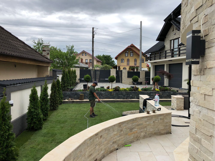 Sistem de irigat automatizat, nivelare si modelare teren, montaj pavele, plantare arbori, arbusti si plante perene, infiintare peluza de gazon rulou, realizare iluminat exterior. montaj piatra decorativa, realizare loc pentru sezut.
